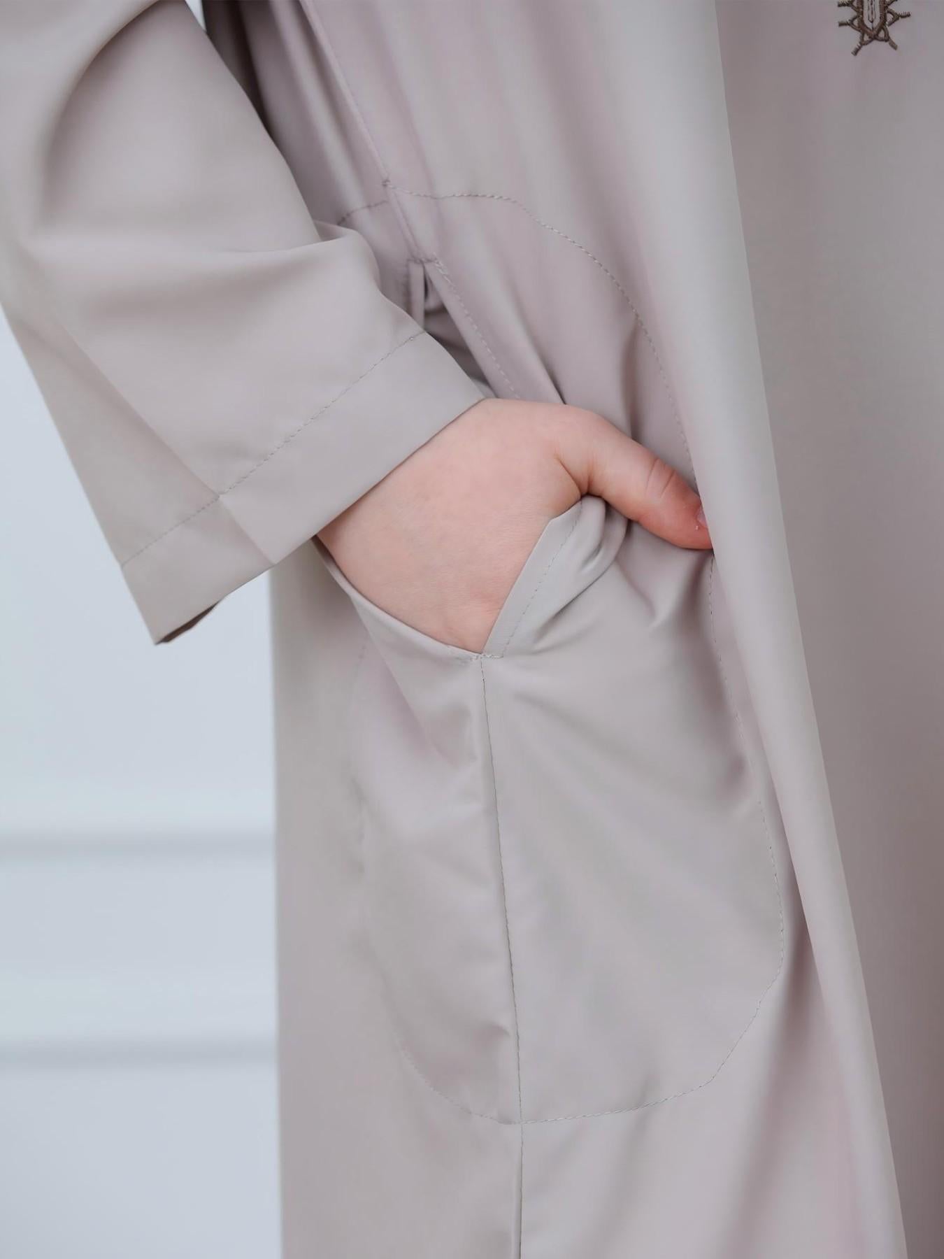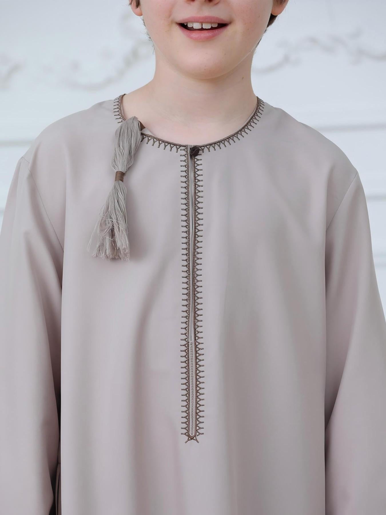 KID0013 Boys' Long Sleeve Embroidered Zipper Omani Robe, Loose-Fitting Modest Style, All Seasons Wear, Muslim Boys' Clothing