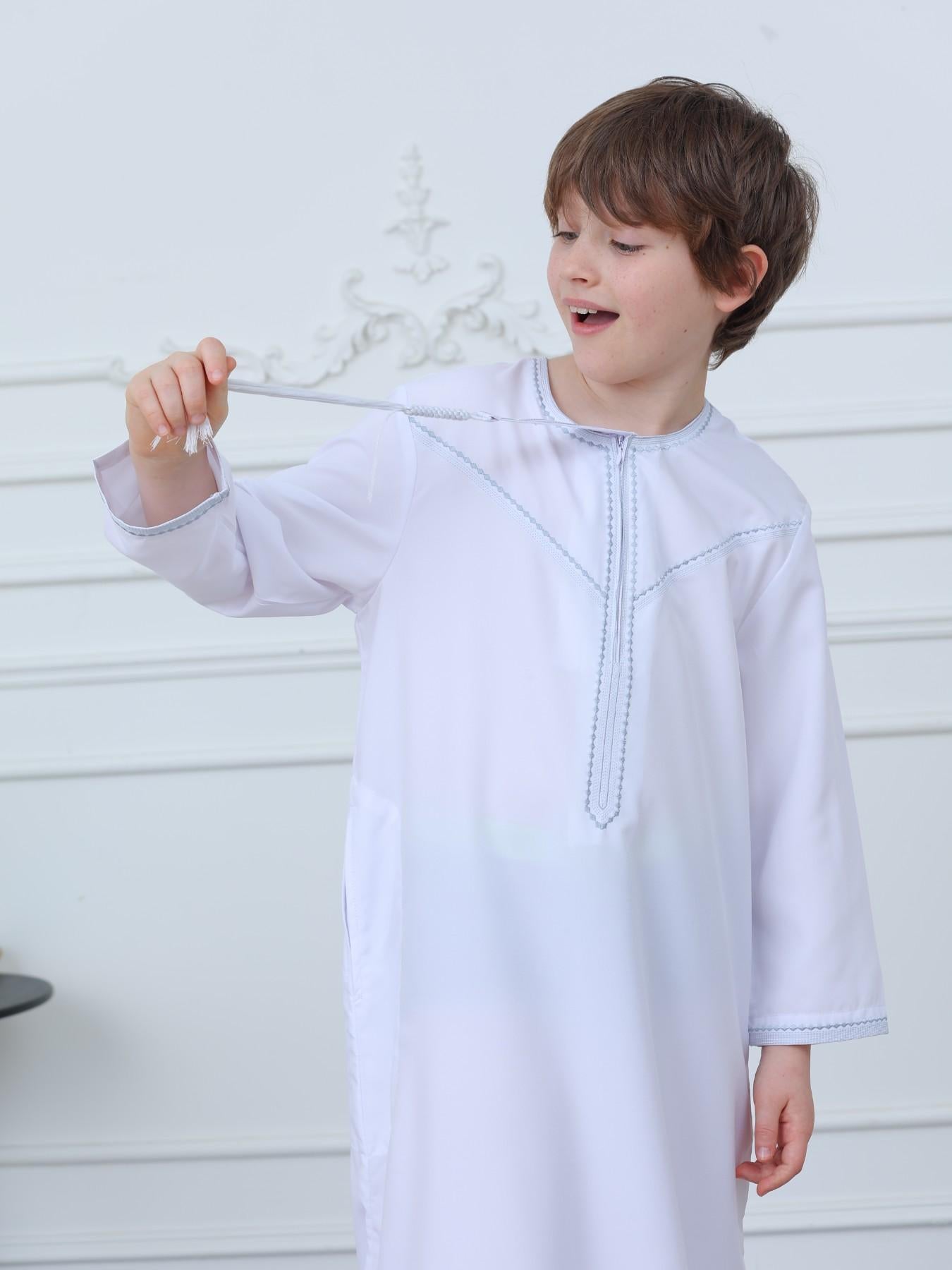 KID0004 Boys' Embroidered Zipper Omani Robe, Ramadan Muslim Boys' Long Dressing Gown, Stylish Islamic Clothing for Kids